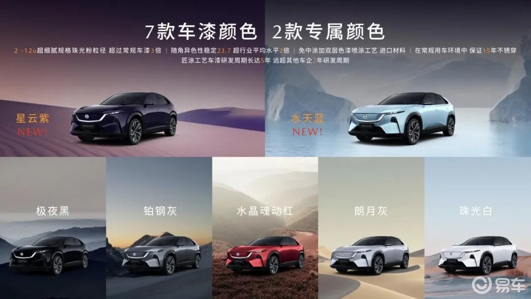 EZ-60前脸采用马自达品牌家族式设计元素,“立体光雕标志之翼” 灯带深度达 60mm,内置72颗高亮度灯珠,夜晚点亮时璀璨夺目,如同水晶般通透立体,带来独一无二的车辆辨识度。新车共提供7种车漆颜色,其中专属的“星云紫”“水天蓝”车漆采用2 - 12μm超细腻珠光颗粒,随角异色性高达 23.7,采用“湿碰湿”三层喷涂工艺,不仅外观亮丽,还能长久保持车身漆面的完美状态。