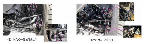 前悬架球头:皮卡前悬架球头属于易损件,Z9采用的一体式球头一旦出问题得换整个控制臂,成本高,修起来麻烦。D-MAX则采用分体式球头(螺接工艺 + 镀彩锌防锈处理),磨损后仅需更换单个部件,可显著降低维修成本,享受更省心的用车体验。