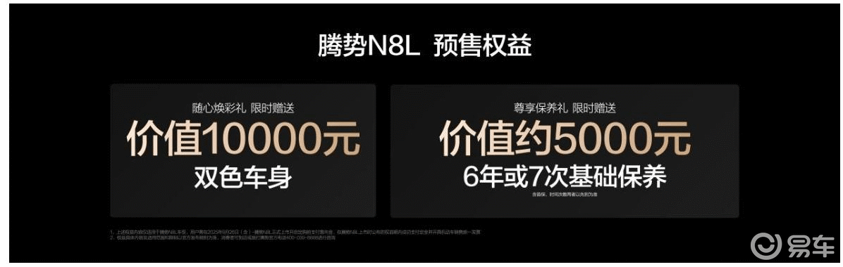 此次预售期间,腾势还为消费者准备了限时专属礼遇:立即预订即可获赠价值 10000 元的双色车身焕彩礼与价值约 5000 元的 6 年或 7 次基础保养(含首保,时间次数以先到为准),为家庭用户带来更多实惠。