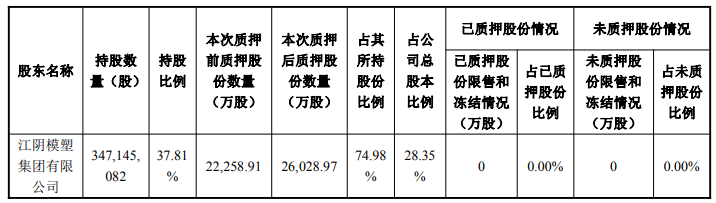 模塑科技2025年9月26日披露的关于控股股东部分股权解除质押和再质押的公告显示,截至公告披露日,模塑集团持股数量为347,145,082股,持股比例为37.81%,本次质押后质押股份数量为26,028.97万股,占其所持股份比例的74.98%,占公司总股本比例的28.35%。
