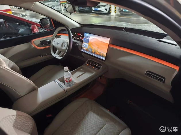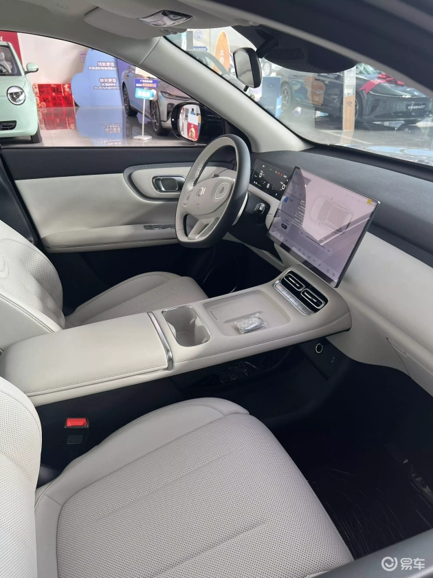 内饰提供玉石白和墨玉黑两种风格。简洁的中控台上配备10.17英寸全液晶仪表盘和15.6英寸悬浮式中控屏,并搭载天枢智能座舱,采用4纳米天玑芯片,接入科大讯飞星火大模型。大量皮质包覆配合镀铬饰件点缀,加之256色环绕式氛围灯,营造出浓郁的豪华气息。此外,还配备三幅式多功能方向盘、电子怀挡、镂空副仪表台、一排物理按键和50W手机无线快充等实用配置。