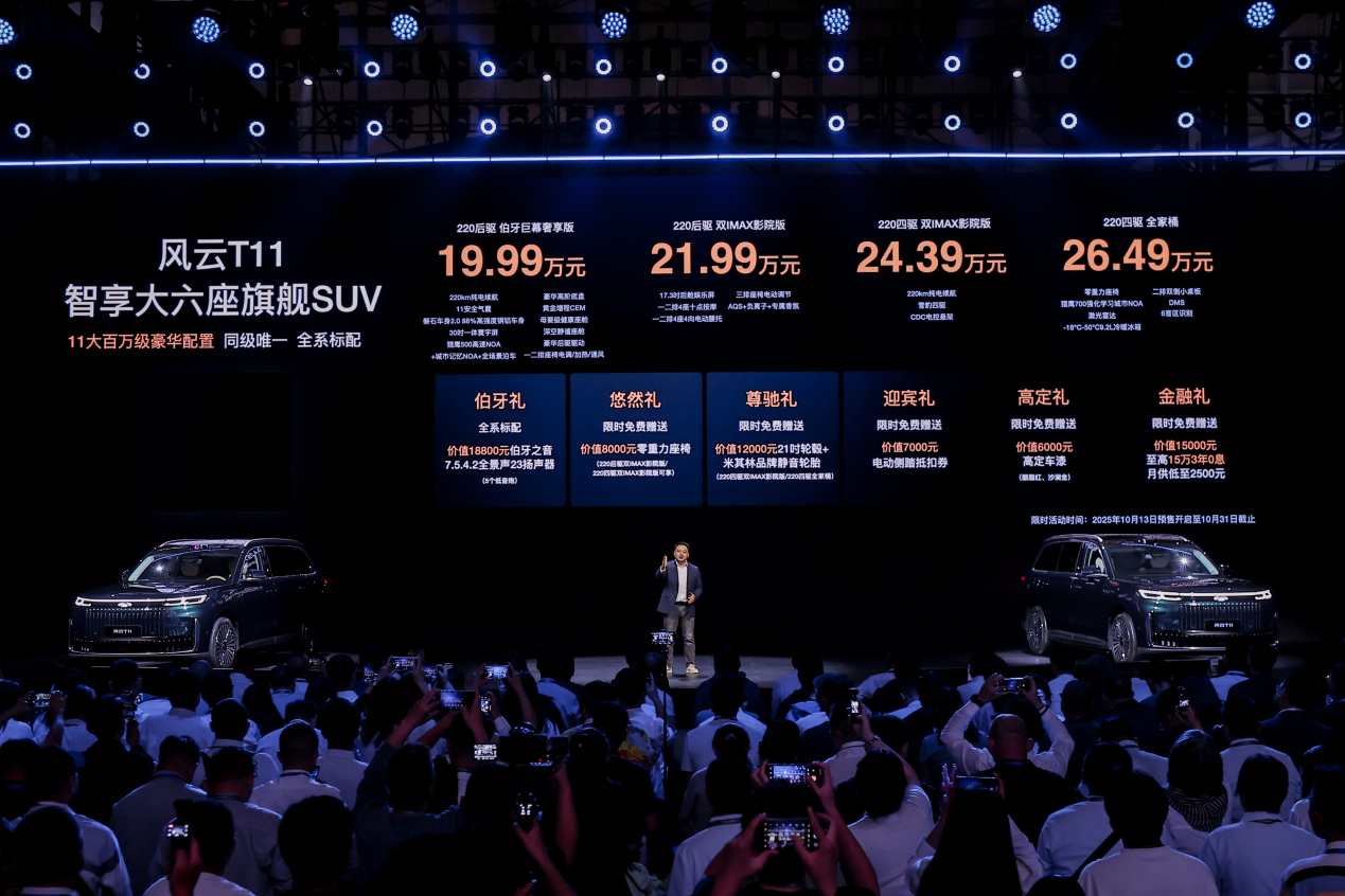 风云T11共推出4款版型,220后驱伯牙巨幕奢享版预售价19.99万元;220后驱双iMax影院版预售价21.99万元;220四驱双IMAX影院版预售价24.39万元 ;220四驱全家桶预售价26.49万元。