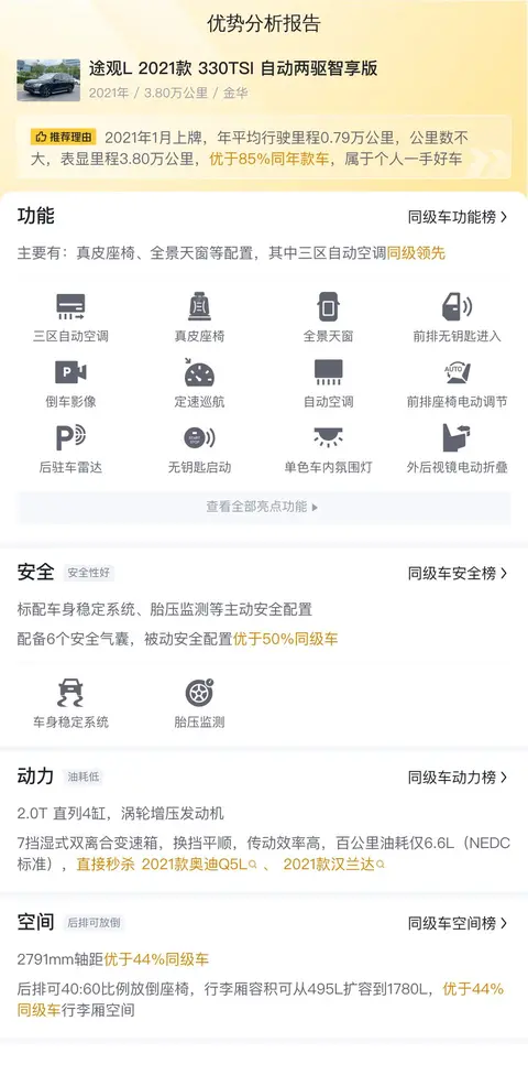 综合来看,途观L 2021款 330TSI 自动两驱智享版在配置、空间、动力、安全等方面表现出色,是一款值得推荐的中型SUV。该车虽然存在内饰材质和保值率方面的一些不足,但对于追求品质、注重性价比的消费者来说,仍然具有较高的购买价值。