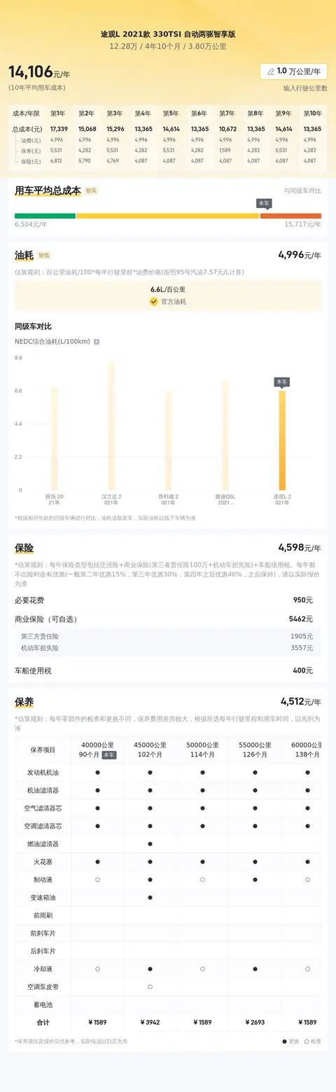 这款车在使用过程中的平均用车成本为每年13648元,这项花费是适中的,具体的实际费用开销可能会因人而异有所变动。