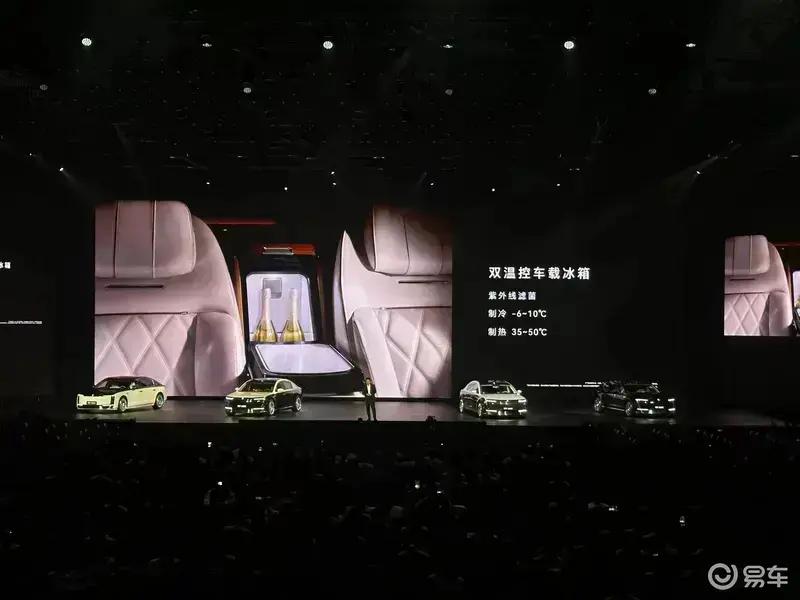 后排座椅中间采用多功能超奢华中岛台设计,集成高端铝合金小桌板、冷暖杯托、无线充电区、压缩机冰箱、一键静音、一键全黑、指纹密码箱等。小桌板拥有多种折叠形态,还集成化妆镜等。冷暖杯托能随时满足后排乘客对饮品不同温度需求。指纹密码箱位于后排座椅前中央扶手后侧下方,可通过后排中岛台指纹模块解锁。