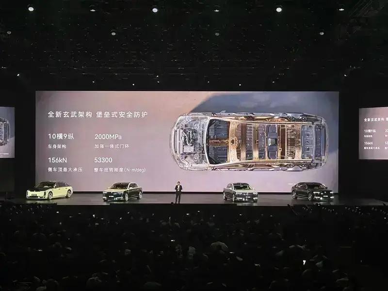 尊界S800搭载了全新的玄武架构,拥有10横9纵车身架构,配备了2000MPa的加强一体式门环,侧车顶最大承压156kN,整车扭转刚度53300N·m/deg。此外,新车全车13气囊超高配置,四重门锁机制含ADS联动解锁。