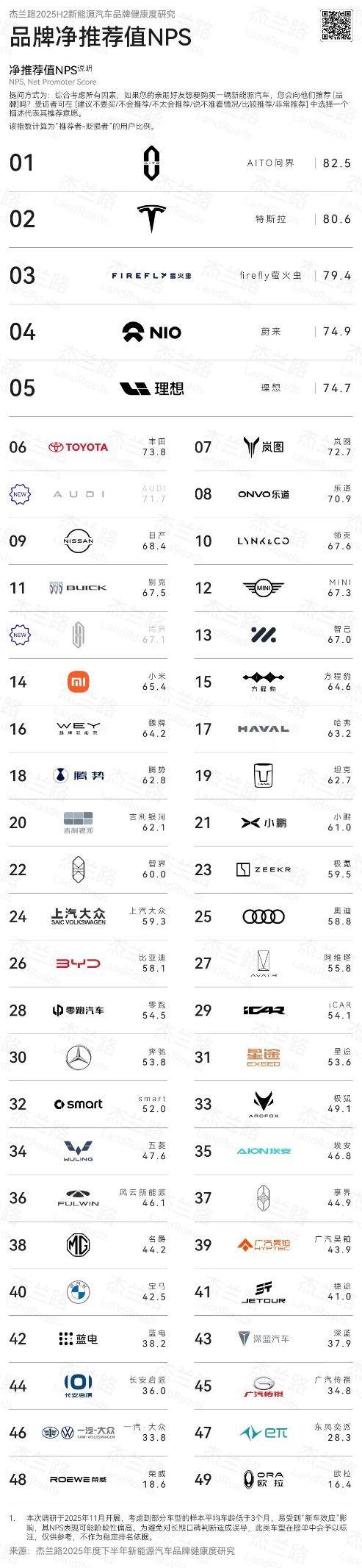 近日,杰兰路咨询发布《2025下半年新能源汽车品牌健康研究报告》。报告显示,问界荣获品牌NPS(净推荐值)第一、品牌发展信心指数第一、30万元以上品牌百人青睐指数第一;问界旗下“双旗舰王牌”,再添口碑佳绩:全景智慧旗舰suv问界M9荣获车型NPS (净推荐值) 第一,家庭智慧旗舰SUV问界M8首次参评即荣获NPS (净推荐值) 第二。这一系列亮眼成绩,无不彰显问界在高端新能源赛道的引领地位。