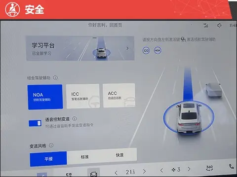 评测车配备千里浩瀚H3辅助驾驶方案,支持高速NOA、语音变道等功能。开启方式十分简便,只需按下方向盘左侧专属按键即可,此时会有图标、声音以及文字进行提示。全速自适应巡航系统可实现自动跟车和刹停,跟车过程中系统响应慢,跟车距离支持三档调节,最近档位与前车间距较大,容易被其他社会车辆加塞。