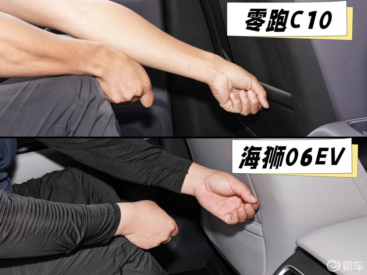 同样对SUV来说,空间也是主要的竞争力之一,结合参数看,零跑C10长宽高4739x1900x1680mm、轴距2825mm,海狮06EV长宽高4810x1920x1675mm、轴距2820mm,尺寸都很大,且双方各有优势。结合实际乘坐看,均以身高177cm的体验者为例,将前排调整到舒适角度后于后排乘坐,此时体验者在2台SUV后排乘坐头顶空间都能剩下2拳,腿部都能剩余2拳多,但轴距更长的零跑C10,余量相对更大一点,春节返乡亲戚朋友满载的情况下,零跑C10表现会相对从容。