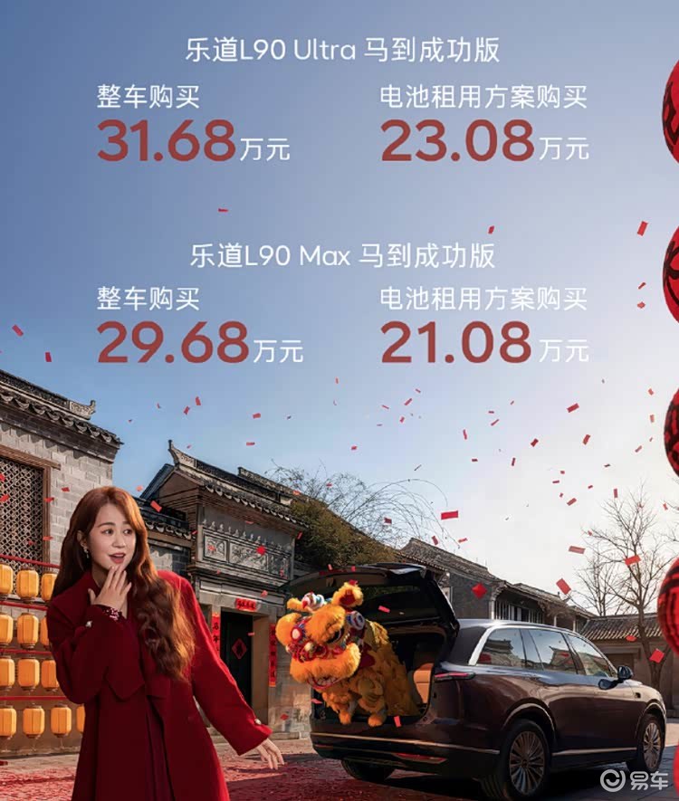 “马到成功版”基于现有L90的Max和Ultra两款六座版车型打造。整车购买方案下,两款配置的售价分别为29.68万元和31.68万元。若选择电池租用方案,两款配置的购买价格则分别为21.08万元和23.08万元。该方案降低了购车门槛,但用户需要持续支付电池租赁费用。
