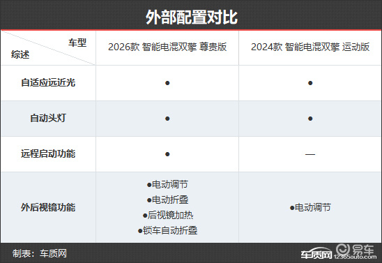 外部配置方面,新款车型依旧配备丰富的灯光配置,有区别的是,新款车型增加了远程启动功能,用户可以远距离预先启动车辆,从而达到提前暖机、通过空调预热或预冷车厢的目的。此外,新款车型的外后视镜还增加了电动折叠、后视镜加热以及锁车自动折叠功能,进一步提升用车体验。