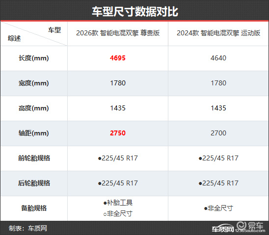 车型尺寸方面,新款车型相比老款车型变化不大,车长增加55mm,部分配置车型轴距增加50mm,其余尺寸保持不变。稍有遗憾的是,新款车型的备胎规格改为补胎工具,非全尺寸备胎则需要额外加价选装。