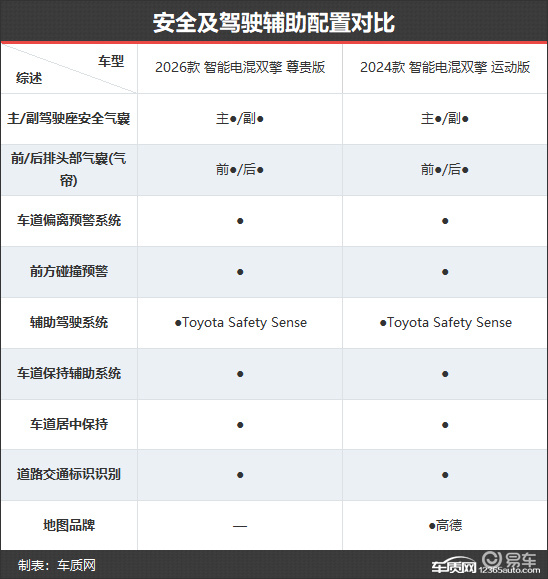 安全配置方面,新款车型保持了老款车型的优势,搭载了主/副驾驶座安全气囊、车道偏离预警系统、前方碰撞预警等丰富的主/被动安全配置。并且新款车型依旧搭载Toyota Safety Sense辅助驾驶系统,具备车道居中保持、道路交通标识识别等功能。