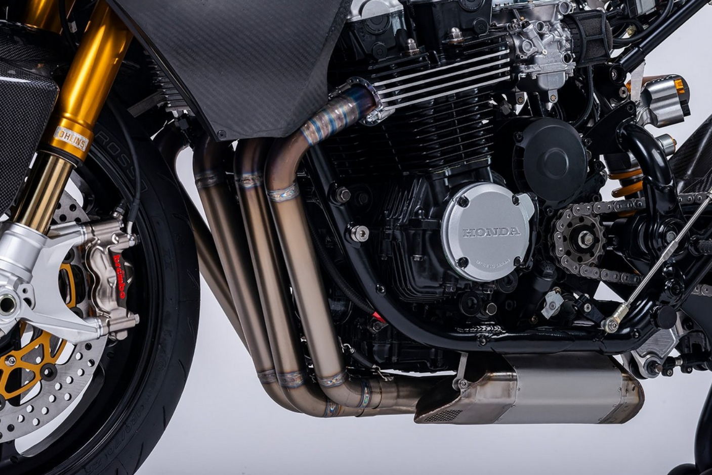 车轮方面,Carriero Corse为这么车换上Marchesini锻造铝圈,前后轮配Pirelli Diablo Rosso II轮胎,提供优异抓地力。 刹车系统升级至Brembo顶级卡钳与浮动320mm前碟盘,后方也使用Brembo卡钳搭配打孔碟盘,左侧还有轻量化后齿盘。 动力提升同样惊人,排气量由原本提升至866cc,搭配自制活塞与缸体加大改装,提高压缩比。 动力通过CBX750六速变速箱传递至后轮,离合器改装为CNC Racing液压机构。 进气采高级泡棉空气滤芯,油温通过PWR机油冷却器与专用软管控制。 Dynojet Stage One调校套件搭配四合一钛合金排气管与不锈钢消音器,使排气系统既轻量又美观。