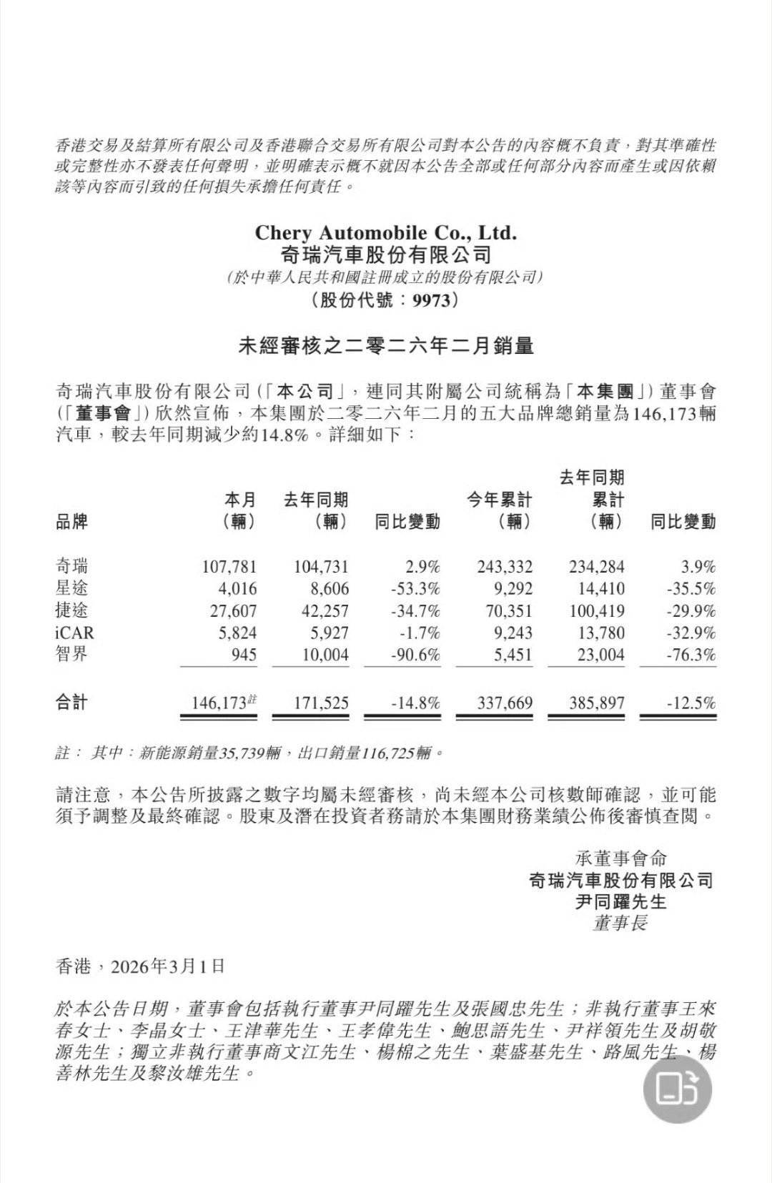 奇瑞集团最新发布的2月产销数据,揭开了智界品牌开年以来的销量滑铁卢。智界2月份共交付新车仅945辆,不仅较去年同期破万的交付规模同比下滑超90%,较今年1月4506辆的交付量,环比跌幅也达到79%,创下品牌上市以来的单月销量最低纪录。拉长时间线来看,2026年开年两个月,智界累计交付量仅5451辆,较去年同期的2.1万辆,同比下滑幅度超76%,开年即陷入销量持续探底的通道,没有任何企稳回暖的信号。更值得关注的,是智界在两大合作阵营中的“掉队”反差。