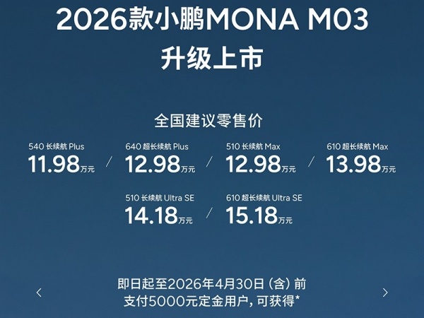 4月2日,新款小鹏MONA M03上市,共推出6款车型,售价区间11.98-15.18万。