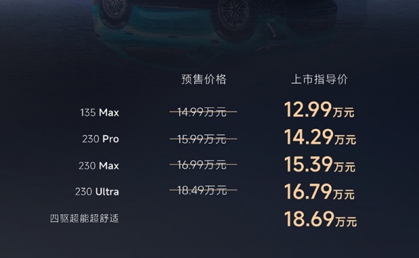 动力方面,新车搭载1.5T鲲鹏超能电混CDM,综合功率375kW,综合扭矩550N·m。顶配车型功率550kW,峰值扭矩860N· m。传动匹配DHT260超混变速箱。新车CLTC纯电续航230km,综合续航2000km。