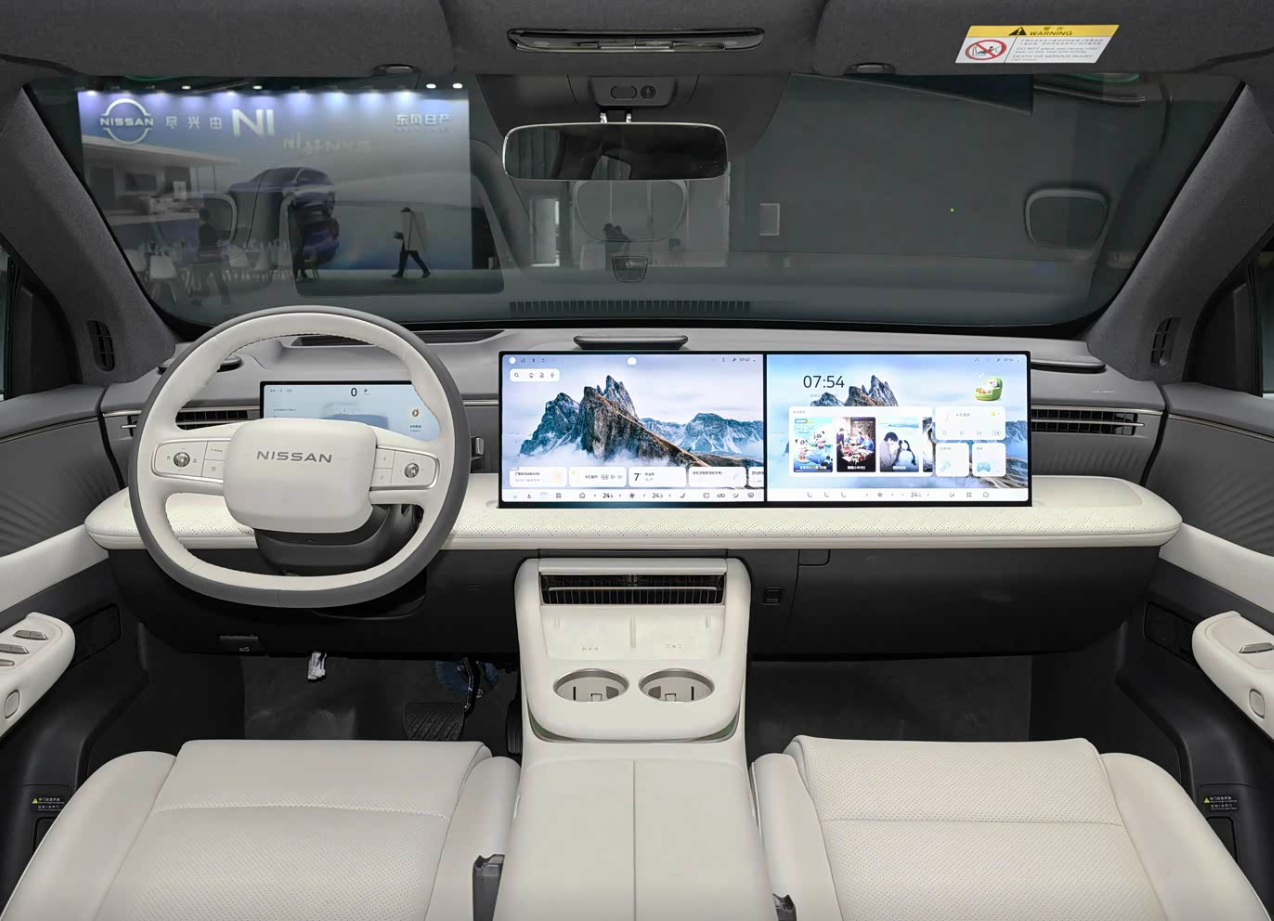 坐进车内,日产NX8采用环抱式的座舱设计,可以营造出明显的居家感。另外,中控台最显眼的就是那块双联屏,尺寸够大且显示效果从图片上看也不错,方向盘采用造型简约的双辐式设计,搭配电子怀挡,操作起来也比较顺手。在其它配置上,日产NX8配备了256色的光瀑式氛围灯,与水波纹饰板融合在一起之后,晚上点亮时会有不错的氛围感。