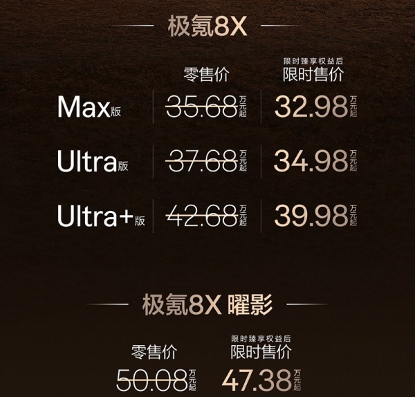 4月17日,极氪8X正式上市,共推出4款车型,售价区间35.68-50.08万,限时权益价32.98-47.38万。