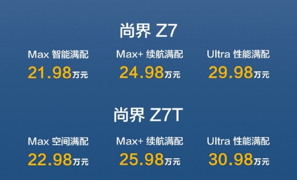 4月22日,尚界Z7/Z7T正式上市,均各推出3款车型,前者售价区间为21.98-29.98万;后者售价区间为22.98-30.98万。